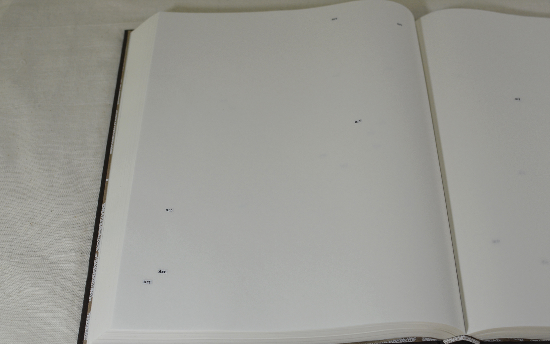 494 instances of the word “art” were removed from the Bible. An oversized Bible was created, and the words were then painstakingly placed in their original positions on the pages of the handmade book. This book was part of a larger installation, Graven Images. Handmade book; 8.5 x 11" closed, 17 x 11" flat; 1113 pages, 2015.