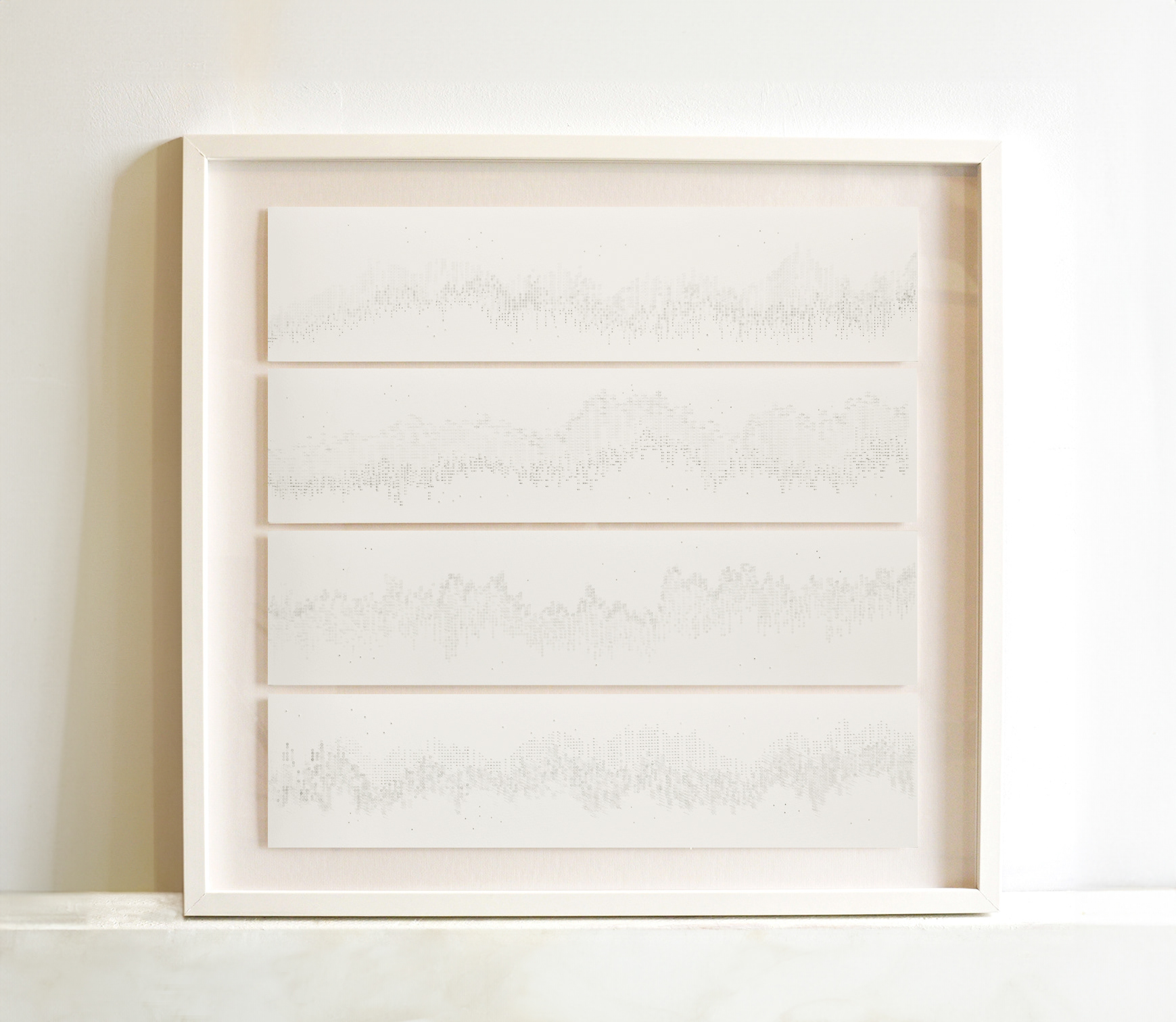 Harry and Jane investigates Harry Houdini’s meeting with spiritualist Jean Leckie in 1922 in his attempt to contact the spirit of his beloved mother, Cecilia Weiss. Through the process of “automatic writing,” Leckie produced a direct message from Weiss that covered 15 pages, which has been deconstructed in these panels. Typewriter ink and sewing needle on paper, 2022-Present (Ongoing Series)